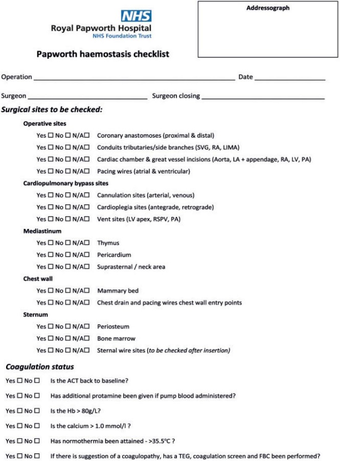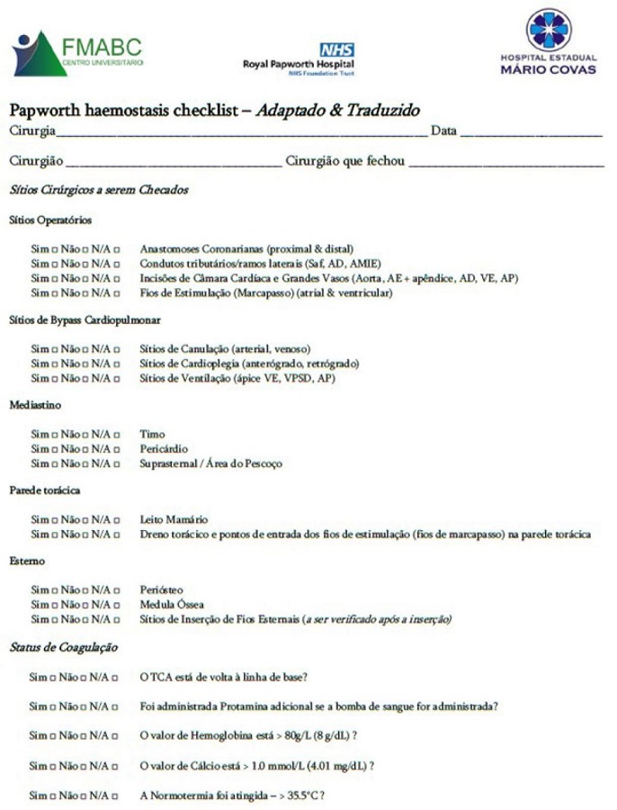 The Papworth Haemostasis Checklist was translated into Portuguese and adapted according to the measurement units (g/dL and mg/dL) used in Brazil and at the Hospital Estadual Mário Covas (Figure 2). This adapted version presents the same questions as the original checklist, except for the last question about the use of thromboelastography, which was not available at the hospital. The checklist was used intraoperatively, before the chest wall closure.