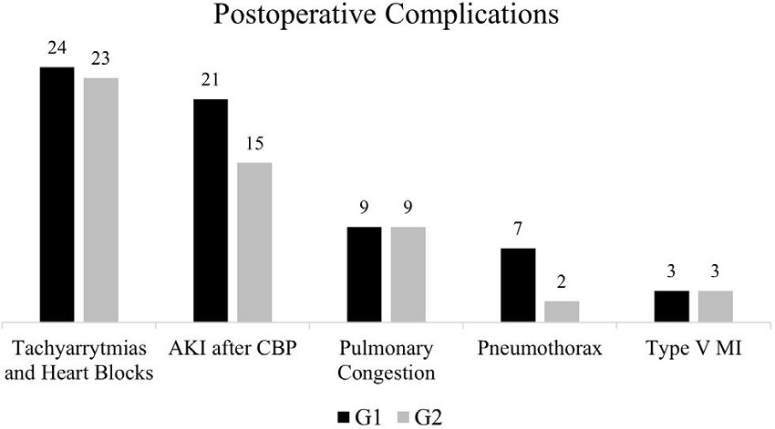 There was a higher occurrence of reoperation in G1; in one patient, it was due to dehiscence of the aortic cannulation suture for cardiopulmonary bypass (CPB), and in another patient, it was due to cardiac tamponade after bleeding in the right atrium. In G2, the reoperated patient presented bleeding from aorta-saphenous vein anastomosis.