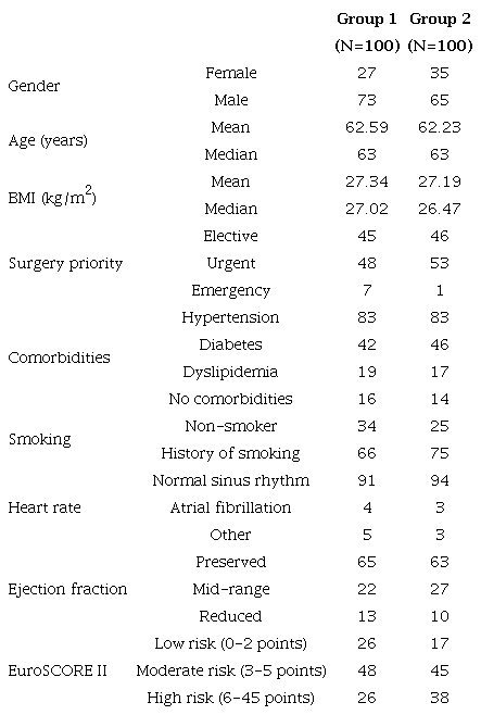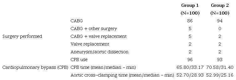 A non-randomized clinical trial was developed at the Centro de Cirurgia Cardiovascular of the Hospital Estadual Mário Covas in a two-year interval. A non-probabilistic sample was obtained with all patients who underwent cardiac surgery (coronary artery bypass grafting, valve replacement, aortic dissection repair, and ventricular aneurysm repair) within the study period, regardless of sex, age, body mass index (BMI), European System for Cardiac Operative Risk Evaluation (EuroSCORE) II, ejection fraction, heart rate, comorbidities, or surgery priority (elective, urgent, or emergency). Patients who underwent heart transplantation or pulmonary thromboendarterectomy were excluded from the study.