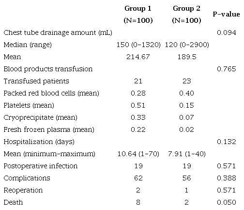 To compare drainage output, amount of blood products, and days of hospitalization between groups, the Mann-Whitney U test was used. In relation to postoperative infection, death, and reoperation, Fisher’s exact test was used. A P≤0.05 was considered statistically significant. The analysis was performed using Stata software version 14.0.