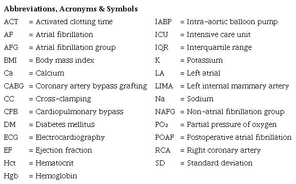 Ismail MF, El-Mahrouk AF, Hamouda TH, Radwan H, Haneef A, Jamjoom AA. Factors influencing postoperative atrial fibrillation in patients undergoing on-pump coronary artery bypass grafting, single center experience. J Cardiothorac Surg. 2017;12(1):40. doi:10.1186/s13019-017-0609-1.