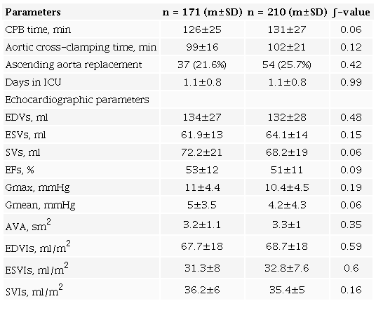 Intraoperative and early echocardiographic characteristics of both groups of patients are presented in Table 2. None of the patients had aortic valve insufficiency in the early postoperative period. The main intraoperative and echocardiographic characteristics were also comparable.