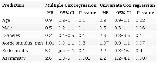 Based on the results of Cox regression, the predictors of aortic insufficiency in the late postoperative period are age (univariant Cox regression, HR 0.9; P=0.02) and asymmetry of neocusps (multiple Cox regression, HR 2.6; P=0.03).