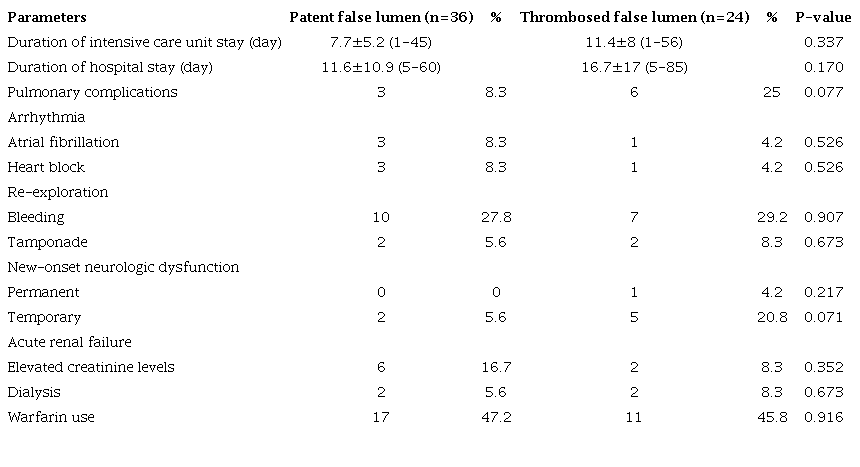 Results: The mean follow-up period of all patients was 37.6±26.1 months (range: 12-104). The diameter increase in the proximal and distal descending aorta was significantly higher in the patent false lumen group (5.3±3.7 mm vs. 3.25±2.34 mm; P=0.015; 3.1±2.52 mm vs. 1.9±1.55 mm; P=0.038, respectively). No significant difference in terms of hypertension was found between the two groups during the follow-up period (21 patients, 58.3% vs. 8 patients, 33.3%; P=0.058). A total of 29 patients (48.3%) were found to be hypertensive in the postoperative period.