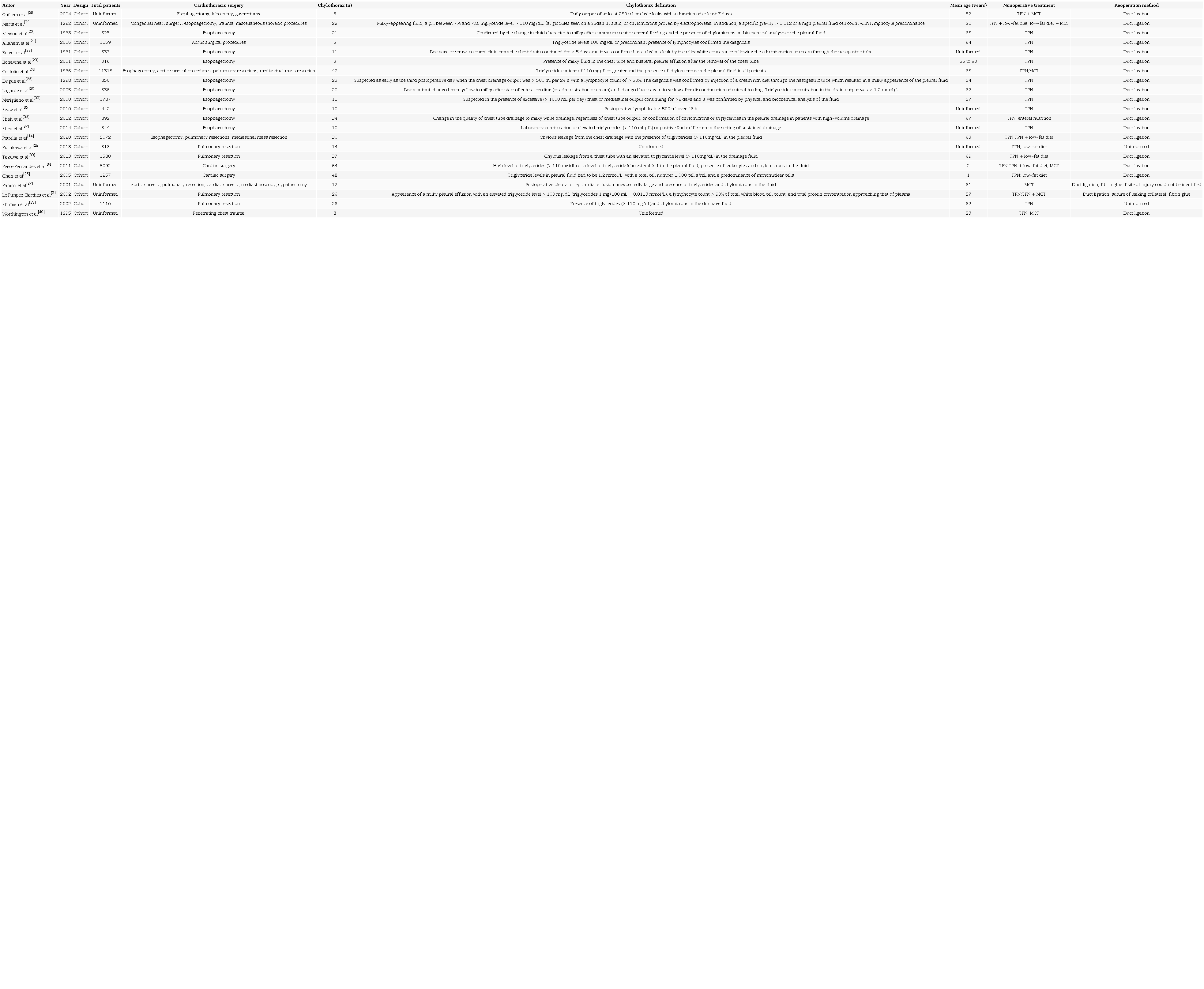 The following data were extracted from the studies: (1) general information (authors, year of publication, study design); (2) patients and chylothorax specifications (total patients, cardiothoracic procedure, patients with chylothorax, chylothorax definition, and mean age); (3) conservative treatment; (4) variables related with population and outcomes (chest time maintenance, reoperation, morbidity, complications, length of hospital stay, mortality).