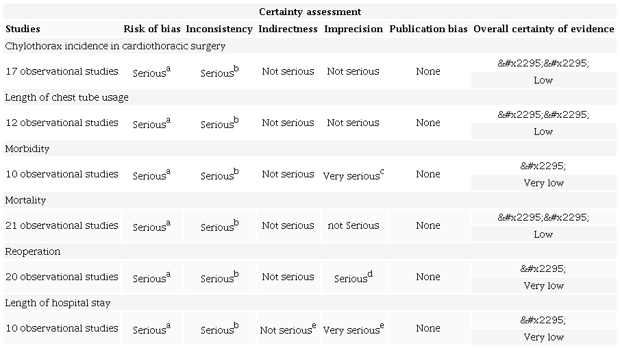 The present study has some limitations. The concept of chylothorax is not homogeneous across the studies, with different definitions. The nonoperative methods for treating chylothorax are also variable across the studies, comprising different types of nutrition and time to decide to perform the reintervention. In addition, it must be considered that a chylothorax is a rare event and that the available studies do not have a large sample size to determine the level of evidence in this theme. The findings of the present study outlined the need for future controlled trials that compare nonoperative methods with early reoperation to verify the best treatment option for chylothorax after cardiothoracic surgery.