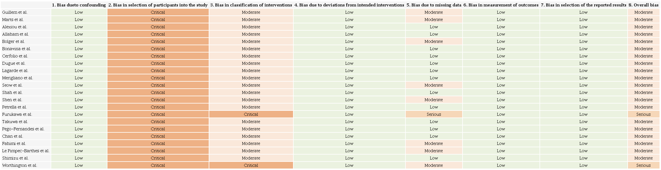 The GRADE critical appraisal showed that most outcomes presented low or very low certainty assessment. The main reasons for the reduced certainty were due to risk of selection bias, clinical heterogeneity among studies (comprising a variety of surgical procedures), and imprecision of data synthesis for some outcomes (Supplementary File 1). ROBINS-I tool showed that the main concerns were risk for selection bias and classification of the intervention (Supplementary File 2).