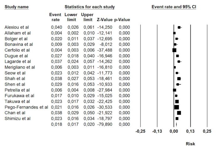 Seventeen studies analyzed this outcome. The chylothorax incidence in patients that underwent cardiothoracic surgery was 1.8% (rate: 0.018; 95% CI: 0.017 – 0.020) (Figure 2).