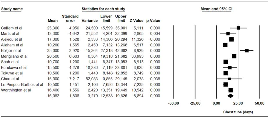 Twelve studies analyzed the length of chest tube usage in patients undergoing nonoperative management of chylothorax. The mean time of chest tube maintenance was 16.08 days (95% CI 12.54 – 19.63) (Figure 3).