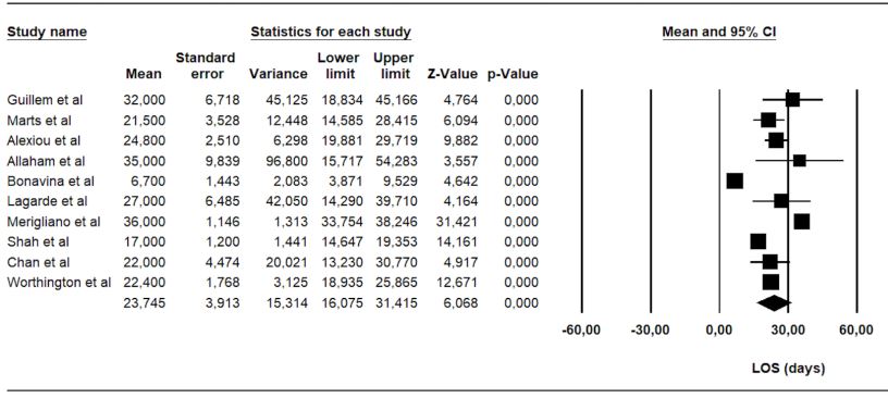 The mean length of hospital stay was 23.74 days (95% CI 16.08 – 31.42) for patients undergoing nonoperative management of chylothorax after cardiothoracic procedures (Figure 4).