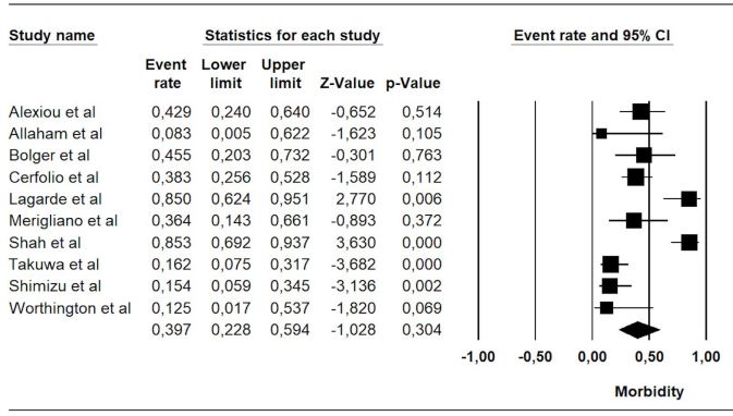 The morbidity among patients that received nonoperative treatment was 39.7% (rate: 0.397; 95% CI 0.23 – 0.59) (Figure 5).