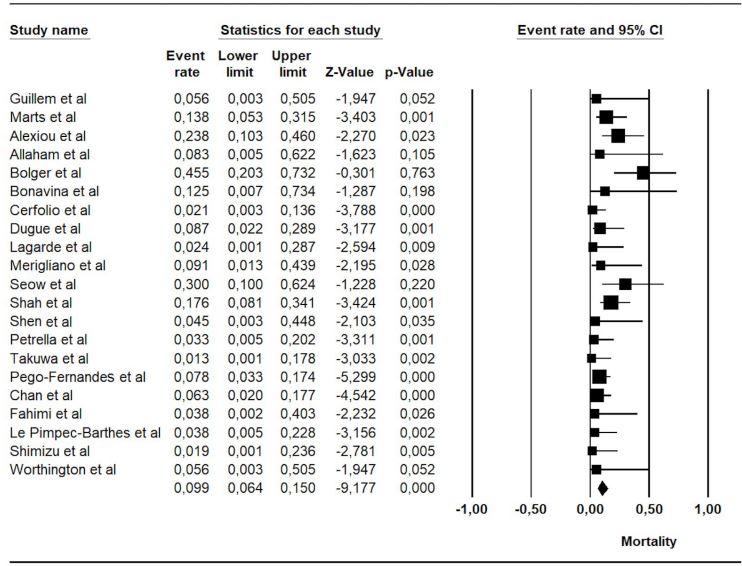 The mortality was 9.9% in patients undergoing nonoperative management of chylothorax (rate: 0.099; 95% CI 0.06 – 0.02) (Figure 6).