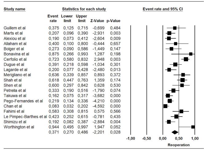 Results: Twenty-two articles were selected. Pulmonary complications, infections, and arrhythmia were the most common complications after surgical procedures. The incidence of chylothorax in cardiothoracic surgery was 1.8% (95% CI 1.7 – 2%). The mean time of maintenance of the chest tube was 16.08 days (95% CI 12.54 – 19.63), and the length of hospital stay was 23.74 days (95% CI 16.08 – 31.42) in patients with chylothorax receiving nonoperative treatment. Among patients that received conservative treatment, the morbidity event was 0.40 (95% CI 0.23 – 0.59), and reoperation rate was 0.37 (95% CI 0.27 – 0.49). Mortality rate was 0.10 (95% CI 0.06 – 0.02).