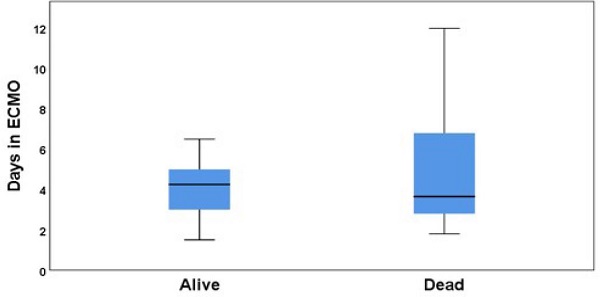 As it was reported by others[7], we also founded a higher mortality but it was not statistically significant in patients with > 10 mg/dL lactic acid level after 24 hours of ECMO assistance. These patients were in salvage status or had a BMI > 34.