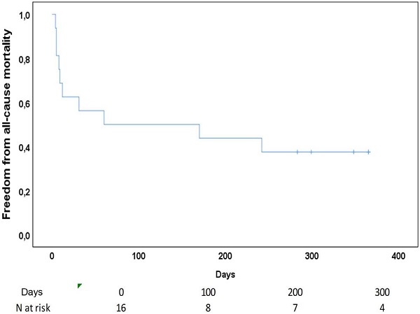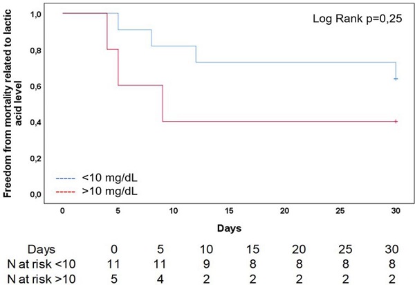 Complications in ECMO are common and increase over the time (Table 3); as it is shown in (Figure 1), patients who required longer ECMO support had higher mortality. The most frequent complication was surgical bleeding, requiring reoperation by cardiac tamponade in 56% of patients (n=9). Limb ischemia occurred in seven patients, two with peripheral cannulation and five with central cannulation. As it was expected, a higher mortality was highlighted in those with higher lactic acid level after 24 hours of ECMO assistance (Figure 2). In-hospital mortality was 44% (n=7) after discharge, three patients died, all of them by cardiac causes at follow-up. The freedom from all-cause mortality at one year of follow-up of the entire cohort was 38% (n=6) (Figure 3).