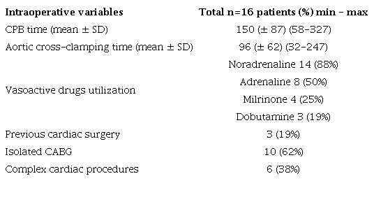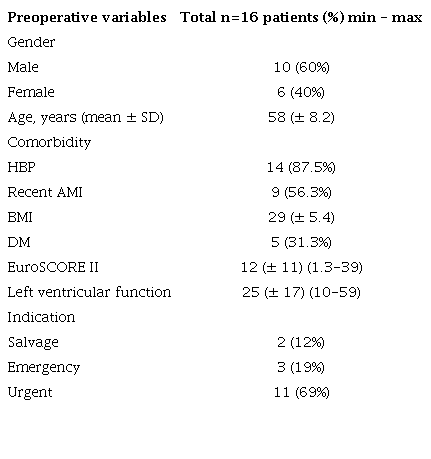Patient’s characteristics are shown in Table 1; 60% of them were men (n=10), 90% had hypertension (n=14), and 69% had left ventricular disfunction (n=11, X=25 ± 17). The mean EuroSCORE II was 12 ± 11, and Survival after Veno-Arterial ECMO score was -3; most of surgeries were performed in an urgent or emergency status. As several series, ECMO was associated with CABG in n=10 patients (62%), and six patients (38%) with complex cardiac surgery. Aortic cross-clamping time and CPB time are shown in Table 2.