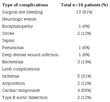 In the other hand, central cannulation was associated with higher rates of bleeding but no difference in overall survival when compared with peripheral cannulation[7,11]. We reported bleeding as the most frequent complication (81%) in our cohort because of recent surgery, usually with fragile tissue due to a reoperation and the early need of anticoagulation.