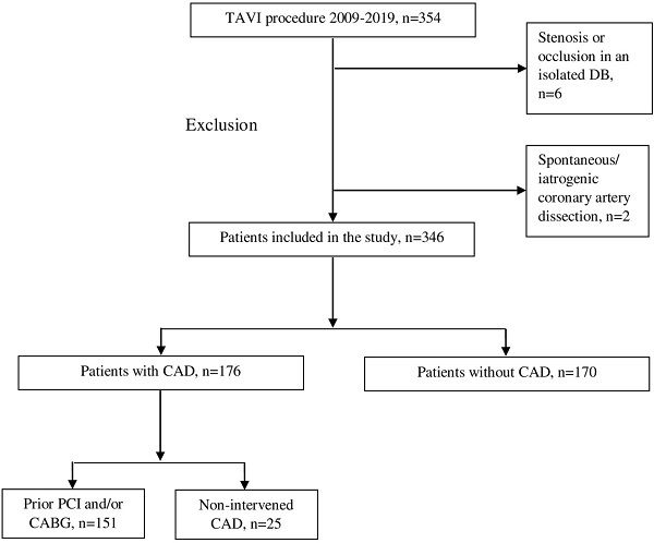 This retrospective observational study included all patients with severe AS undergoing TAVI between September 15, 2009, and November 29, 2019, at Örebro University Hospital (Örebro, Sweden). All included patients had intermediate to high surgical risk. Patients were divided into two groups according to the presence or absence of CAD. All patients underwent preoperative coronary angiography, except for a few cases where computed tomography angiography was performed. Patients with solitary stenosis or occlusion in a minor side branch were excluded from the study. Patients with spontaneous or iatrogenic coronary artery dissection were also excluded (Figure 1). The study was approved by the regional ethical review board (file number: 2019-06442).