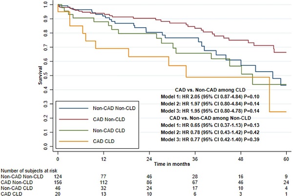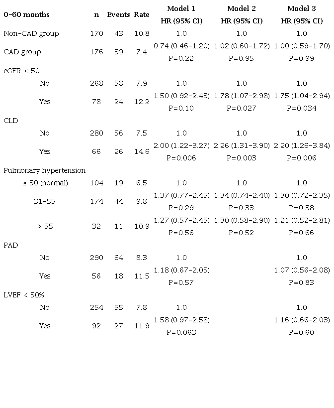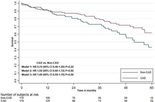 The mean total follow-up time was 2.2±1.6 years. Among patients with surgery before December 1, 2014, with possible five-year follow-up, the all-cause mortality was 42/80 (52.5%); 23/48 (47.9%) in the CAD group and 19/32 (59.4%) in the non-CAD group. Cardiac death was numerically more common in the CAD group (13/23) than in the non-CAD group (8/19), but the difference was not statistically significant. Cause of death was missing in two patients in each group. A Kaplan-Meier curve illustrates the cumulative, unadjusted five-year survival in the CAD and non-CAD groups (Figure 2) in all 346 patients. Cox regression revealed no differences in five-year all-cause mortality between patients with and patients without CAD in the three different adjustment models (Table 2). In the third adjusted model, HR was 1.00 (95% CI 0.59-1.70), but patients with eGFR < 50 ml/min/1.73 m2 (HR 1.75 [95% CI 1.04-2.94]) and CLD (HR 2.20 [95% CI 1.26-3.84]) had a significantly increased mortality risk (Table 2).