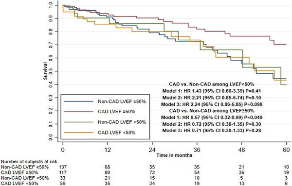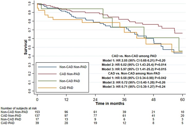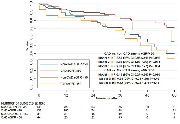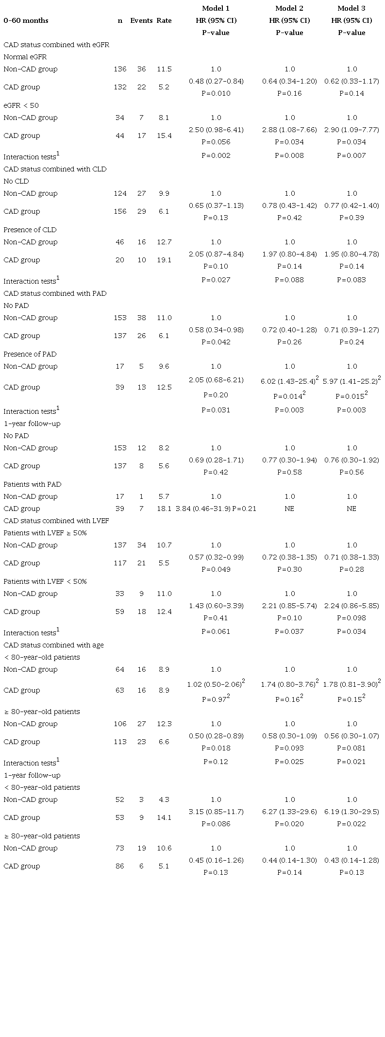 Impaired renal function and presence of PAD showed a statistically significant interaction effect with CAD and mortality in all three adjusted models, with LVEF < 50% and age (≤ 79 vs. ≥ 80 years) only in the second and third adjusted models and with CLD only in the first adjusted model (Table 3, Figures 3 to 5, and Supplementary Figures 1 and 2).