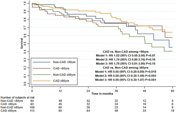 Among patients with impaired renal function, the HR was 2.90 (95% CI 1.09-7.77) when comparing the CAD and non-CAD group in the third adjusted model. Among patients with PAD, the HR was 5.97 (95% CI 1.41-25.2); however, the hazard was non-proportional and because of few mortality cases it was not possible to evaluate only the first year of follow-up. Among patients with LVEF < 50%, the HR was 2.24 (95% CI 0.86-5.85) when comparing the CAD and non-CAD group. Among patients aged < 80 years, the HR was 1.78 (95% CI 0.81-3.90) but the hazard was non-proportional, and for the first year of follow-up, the HR was 6.19 (95% CI 1.30-29.5). Among patients with CLD, the HR was 1.95 (95% CI 0.80-4.78) (Table 3).