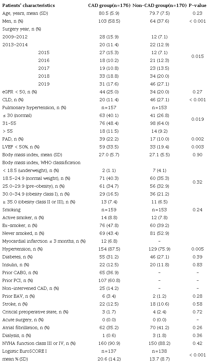 In total, 176/346 (50.9%) patients had concomitant CAD and AS, while 170/346 (49.1%) had AS only. Prior PCI and/or CABG was performed in 151/346 (43.6%) patients, and 25 patients had CAD without prior coronary intervention. Baseline clinical characteristics are shown in Table 1. Significantly more patients in the CAD-AS group were males, and had PAD, a LVEF < 50%, hypertension, or a higher logistic EuroSCORE I. In the non-CAD group, more patients had CLD and elevated pulmonary artery pressure.