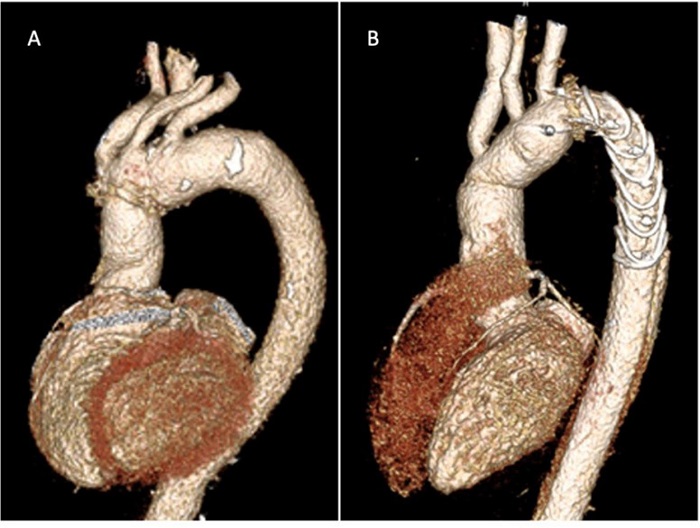 During the period from 2000 to 2010, the FET technique was performed using the custom-made Chavan-Haverich prosthesis followed by the prefabricated Chavan-Haverich hybrid graft (Curative GmbH, Dresden, Germany). The use of the Jotec E-vita® hybrid graft was established after it became available. Until 2010, the island technique was performed to reattach the supra-aortic vessels. In cooperation with Vascutek Terumo (Terumo®, Glasgow, United Kingdom), we developed the four-branched FET which was frequently used since 2010. For a total or hemiarch replacement, we changed our strategy from a straight graft with island technique to the branched Sienna™ graft (Terumo®, Glasgow, United Kingdom) in 2008. Due to the extensive use of branched aortic arch, prosthesis resulted in major technical changes. As a consequence of these changes, the arch replacement was performed after completing the cardiac and distal aortic repair. Head vessels were anastomosed to the corresponding side branches of the graft at the end of the procedure. In all cases, either a proximal, subtotal (involving replacement of the brachiocephalic trunk), or total arch replacement with ET or FET, HCA (temperatures between 22°C and 26°C), and bilateral selective antegrade cerebral perfusion (SACP) were performed. In 2010, we started the beating heart technique for cardioprotection during total arch repair. An isolated replacement of the proximal aortic arch was performed using a straight Dacron® graft or a Gelweave™ Ante-Flo beginning in 2010. CT imaging of the proximal arch and the four-branched FET is shown in Figure 1.