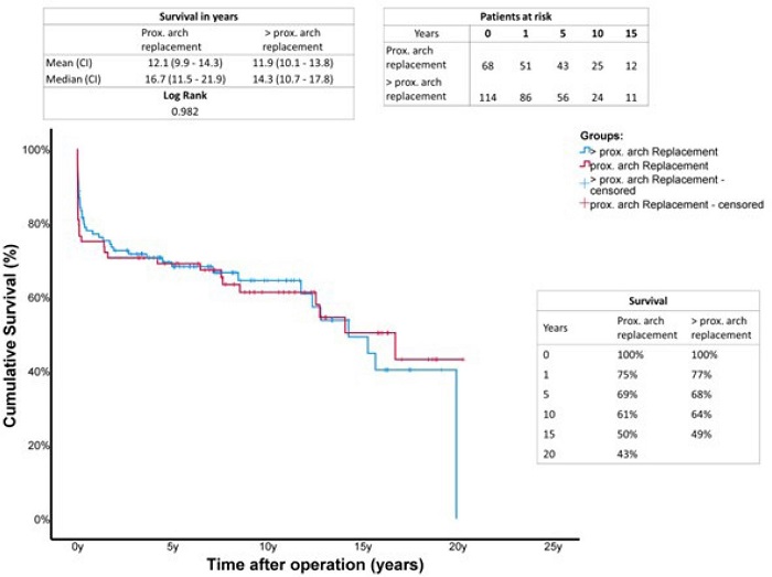 The postoperative outcome is shown in Table 4. Early survival (30-day mortality) was equal in both populations. The proximal arch population was on mechanical ventilation for a significantly shorter time (group A 32 hours [115.3-87.8] vs. group B 55 hours [21.5-179.5]; P=0.022) and had shorter patient stay in the intensive care unit (ICU) (group A 3.0 days [2.0-5.0] vs. group B 5.0 days [3.0-9.0]; P<0.001). Furthermore, more renal failure with temporary postoperative need for dialysis was seen in the full arch replacement population (group A 5.9% [n=4] vs. group B 15.8% [n=18]; P=0.047). Newly diagnosed strokes using multi-slice CT were equal in the limited approach (four patients; 5.9%) and the extended arch surgery (15 patients; 13.2%) populations. Follow-up data are displayed in Table 5. The surviving population showed no significant difference in the rate of secondary aortic operations, and reoperation of the aorta in the identic area or downstream aorta. Furthermore, the rate of thoracoabdominal aortic repair was similar in both groups. Kaplan-Meyer (Figure 2) analysis for survival after a 20-year follow-up showed no significant benefit for either population.
