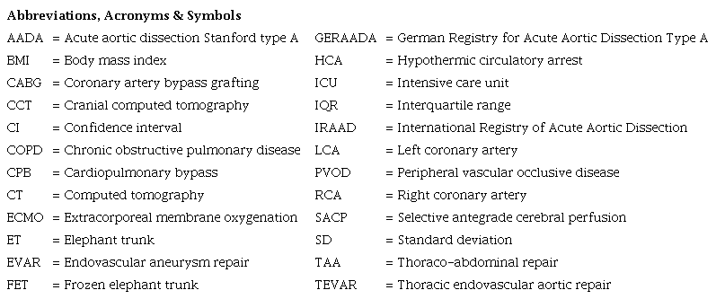 Conzelmann LO, Weigang E, Mehlhorn U, Abugameh A, Hoffmann I, Blettner M, et al. Mortality in patients with acute aortic dissection type A: analysis of preand intraoperative risk factors from the German registry for acute aortic dissection type A (GERAADA). Eur J Cardiothorac Surg. 2016;49(2):e44-52. doi:10.1093/ejcts/ezv356.