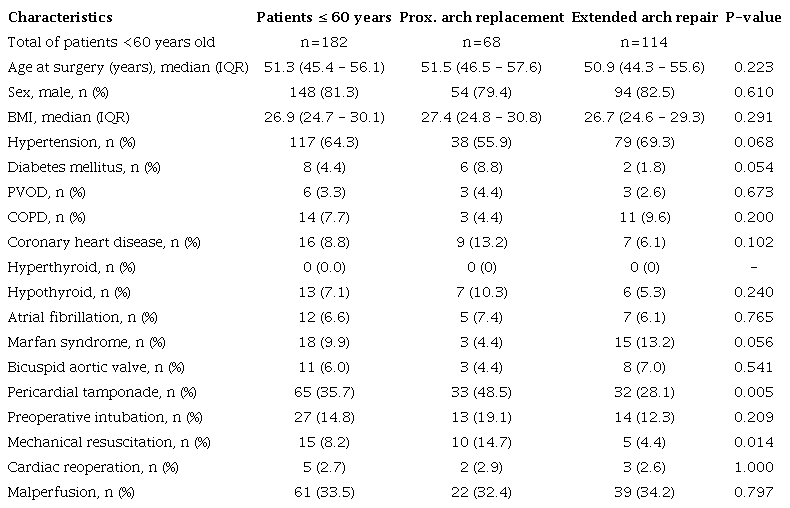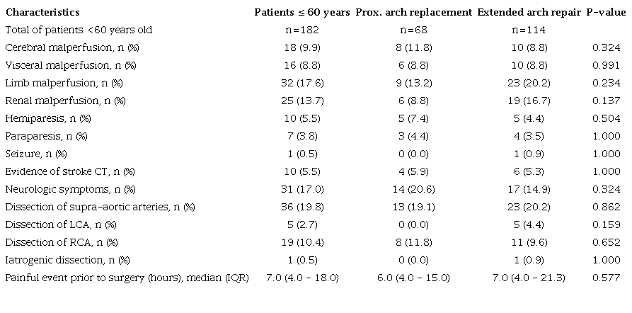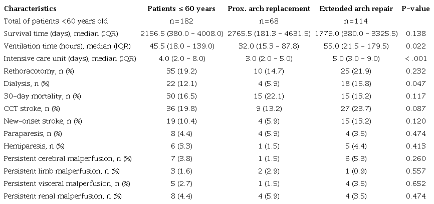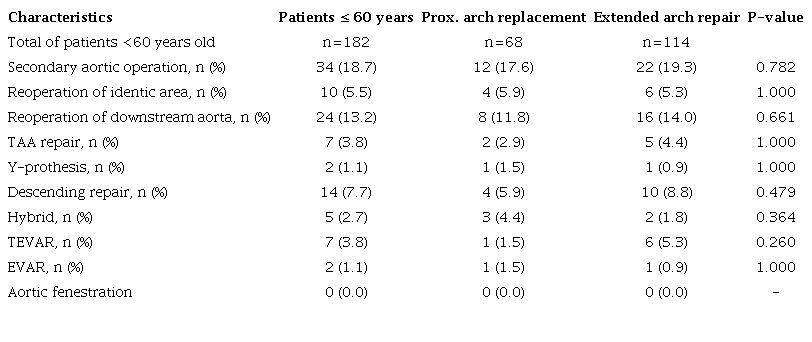 Introduction: Acute aortic dissection Stanford type A (AADA) is a surgical emergency associated with high morbidity and mortality. Although surgical management has improved, the optimal therapy is a matter of debate. Different surgical strategies have been proposed for patients under 60 years old. This paper evaluates the postoperative outcome and the need for secondary aortic operation after a limited surgical approach (proximal arch replacement) vs. extended arch repair.