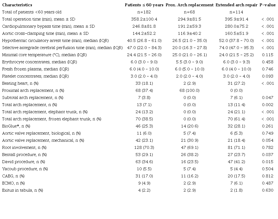 A retrospective analysis of all 503 patients receiving surgical treatment for AADA at our tertiary medical center between January 2000 and January 2018 was done. De Bakey II dissections were not included in this study. Over one-third of all patients (182 patients; 36.2%) were under 60 years old at the time of presentation. The mean patient age of the under 60-year cohort was 51.3 years (interquartile range [IQR] 45.4 - 56.1 years). The study population was divided into two groups: patients treated with a limited approach including replacement of the ascending aorta and proximal arch (n=68; 37.4%) and patients treated with complete arch replacement (> prox. arch) (n=114; 62.6%). All data were collected retrospectively and were approved by our institutional ethics committee (10519_BO_K_2022). All patients’ characteristics are stated in Table 1. Follow-up of patient data ended on 01/2022 and was 100%.