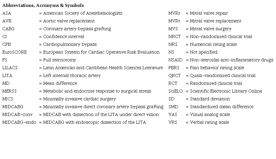 It is expected that smaller incisions can be less painful than full sternotomy (FS), but, considering the postoperative pain evaluation scores, it is still unclear whether cardiac surgery by mini-incision (minimally invasive cardiac surgery [MICS]) is superior to the conventional technique, even though one of the first MICS dates back to around 1995[4]. Data from previous studies are not conclusive, so efforts should be made to review the main evidence in this field to establish a greater clarification and contribute to the decision-making process of the teams involved with invasive heart procedures. Thus, this study aimed to compare the intensity of postoperative pain, measured at least in one moment over the first seven days, between FS and mini-incision in myocardial revascularization surgeries, mitral valve surgery (MVS), and aortic valve replacement (AVR). We analyzed postoperative pain as a primary outcome. The difference in the demand for analgesics between the groups in the postoperative days was analyzed as a secondary outcome.