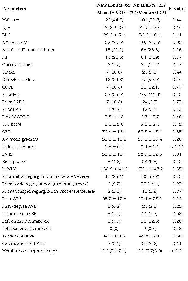 In the overall patient population, the incidence of new LBBB after TAVR was 20.2%. Baseline clinical and instrumental characteristics of patients are presented in Table 1. In patients with new LBBB, there was a significantly smaller indexed aortic valve area (0.3 ± 0.1 mm vs. 0.4 ± 0.1 mm, P < 0.01) and interventricular membranous septum length (6.2 ± 1.6 mm vs. 6.9 ± 1.8 mm, P < 0.01).