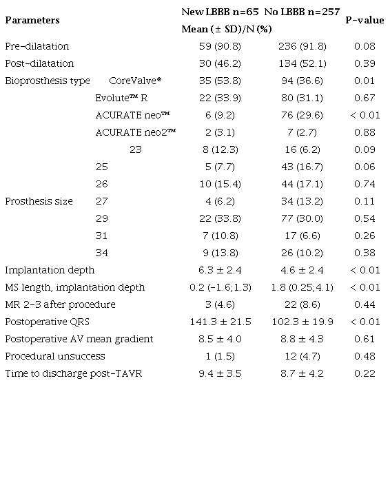 Procedural results are presented in Table 2. The use of the first-generation CoreValve® prosthesis was more frequent among patients with new LBBB compared with patients without LBBB (53.8% vs. 36.6%, P = 0.01). Moreover, the groups were significantly different in implantation depth (6.3 ± 2.4 mm in the new LBBB group and 4.6 ± 2.4 mm in the no LBBB group, P < 0.01) and in the arithmetic difference between membranous septum length and implantation depth (0.2 [-1.6;1.3] in the new LBBB group vs. 1.8 [0.25;4.1] in the no LBBB group, P<0.01). There were no significant differences in preor post-dilatation between the two groups. Similarly, the frequency of procedural failure and duration of post-TAVR hospitalization did not differ significantly.