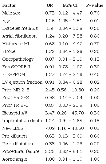 The incidence of LBBB following TAVR varies between studies, with around one-quarter of cases experiencing the first occurrence of LBBB with the use of first-generation valves[18,19]. Specifically, the development of LBBB was most commonly observed with CoreValve® self-expanding transcatheter valves (Medtronic Inc., United States of America), with rates ranging from 18% to 65%, compared to Edwards SAPIEN™/SAPIEN XT™ balloon-expandable valves (Edwards Lifesciences, United States of America), where rates ranged from 4% to 30%[20]. Data on the occurrence of LBBB with the use of new generation valves are limited, with reported incidences ranging from 12% to 22% following implantation of the Edwards SAPIEN™ valve[21,22]. Similar results have been observed in studies using Portico™ self-expanding bioprosthesis (St. Jude Medical, United States of America) and next-generation Evolut™ R and Evolut™ R PRO valves (Medtronic Inc., United States of America) with a reported incidence of new LBBB ranging between 18 and 28%[23,24]. Our findings regarding the incidence of LBBB are generally consistent with the literature and emphasize the relevance of this topic. It is noteworthy that the differences observed in certain parameters among the comparison groups in our study (Table 1) support the potential relationship of LBBB with various procedural and anatomical factors, such as the depth of implantation, the type of bioprosthesis, as well as the membranous septum length. It is important to consider the fact that in more than a third of patients, LBBB that developed after TAVR resolves after discharge from the hospital. Nazif et al.[7] reported LBBB resolved in 42.1% of patients within 30 days after TAVR.