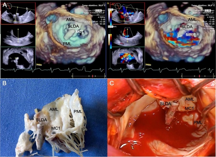 Cardiopulmonary bypass (CPB) was instituted through left common femoral artery and bicaval cannulation after re-sternotomy. Deep hypothermic status was the target (17.2°C nasopharyngeal temperature). CPB was interrupted and retrograde cerebral perfusion performed through the right internal jugular vein. Cold blood cardioplegia was delivered in a retrograde fashion. Mitral valve exposure through left atriotomy was partially restricted by the mechanical aortic prosthesis and the incompressible PA, thus limiting the view of the anterior annulus. Our echocardiographic suspicions were confirmed, with one clip efficiently grasping A2-P2 scallops, a SLDA (A2 lateral portion), and a torn posterior leaflet (P2 lateral portion) (Figure 1). The valve was not amenable to repair, so it was excised, and a bovine pericardial bioprosthesis was implanted. After a 40-minute DHCA, CPB was re-started. De-airing was obtained by CO2 flooding and ascending aorta venting through a needle placed in a confined area without calcifications. The postoperative period was free of major complications. Progressive improvements in both hemodynamics and physical performance were observed in the following days. Pre-discharge transthoracic echocardiography showed both aortic and mitral prostheses properly working and no paravalvular leakage, confirmed at echocardiography four months later. On the 11th postoperative day, he moved to the rehabilitation department.