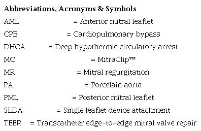 We report the case of a 79-year-old man who had undergone, 30 years before, single coronary artery bypass grafting and aortic valve replacement with a mechanical prosthesis. One month before current hospitalization, due to worsening dyspnea, he had undergone TEER for severe mitral regurgitation (MR) by MitraClipTM (MC) system (Abbott, Abbott Park, Illinois, United States of America) in a different hospital. Patient charts reported the application of two clips grasping A2 and P2 scallops, but significant MR was still evident. PA was deemed an absolute contraindication to rescue surgery and, accordingly, he was discharged on medical therapy. A few weeks later, an episode of acute heart failure despite optimal medical therapy led the patient to our emergency room. Our echocardiogram confirmed severe MR caused by posterior leaflet tear with the lateral clip grasping only the anterior leaflet (single leaflet device attachment [SLDA]) (Figure 1). A computed tomography scan confirmed the presence of PA (Video 1) and diffused calcific arteriopathy that forced us to exclude the options of an endoclamp and of circulatory arrest with antegrade cerebral perfusion through right subclavian artery cannulation. However, spots free from calcifications along the femoral arteries were judged eligible for peripheral cannulation. Despite the high surgical risk (European System for Cardiac Operative Risk Evaluation II 21.86% and Society of Thoracic Surgeons risk of morbidity or mortality 26.3%), we decided to perform a surgical correction of the TEER failure, since no effective transcatheter options were available and the patient was in good physical and cognitive status.
