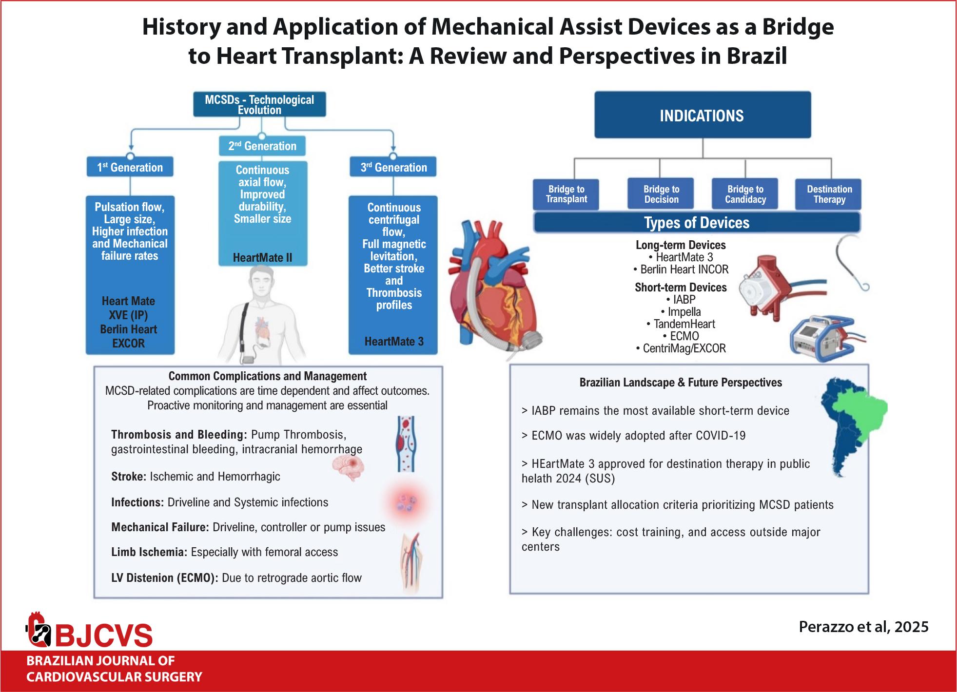 In this context, the present article seeks to conduct a comprehensive review of the most significant MCS devices currently in use across the globe. Furthermore, this analysis extends to evaluating the availability, integration, and clinical outcomes of these technologies within Brazil’s healthcare system. By offering a detailed examination of the status of these devices in Brazil, this review aims to provide an insightful perspective on the current landscape of MCS in the country, highlighting both its achievements and the areas requiring further development and investment, a brief of this work is shown in Central Illustration.