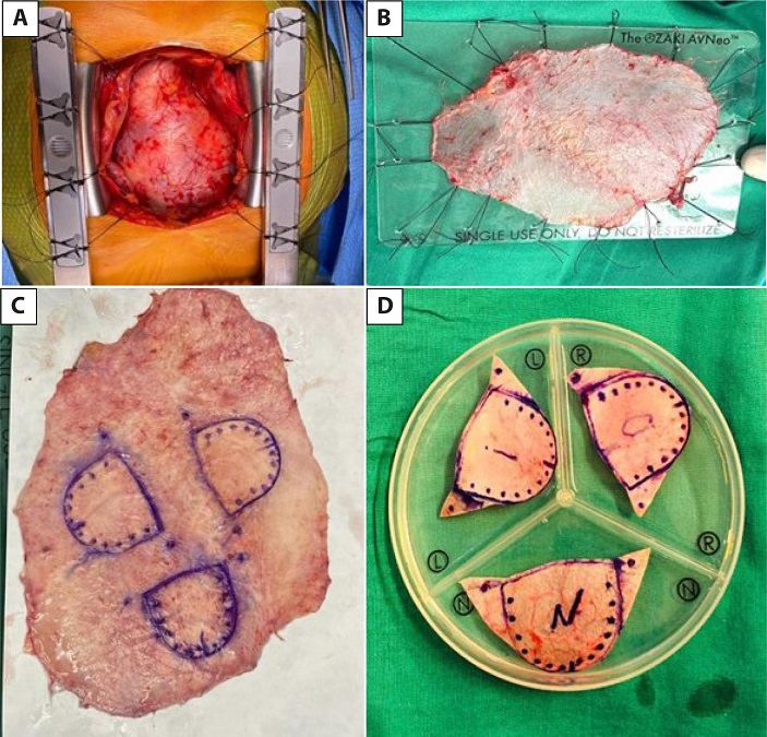 Surgery is performed under general anesthesia with standard invasive monitoring for aortic valve replacement. All patients undergo transesophageal echocardiography. The pericardium is accessed through a median sternotomy. The anterior pericardium is dissected, freeing the pleurae up to the phrenic nerves and the mediastinal fat from the diaphragm to the innominate vein. A portion of pericardium of approximately 10 × 10 cm is resected, stretched, and fixed on a medical grade acetate sheet to remove the remaining tissue (Figures 1A and B). The pericardium is treated with a 0.6% glutaraldehyde solution for 10 minutes and washed in physiological saline for six minutes three times.