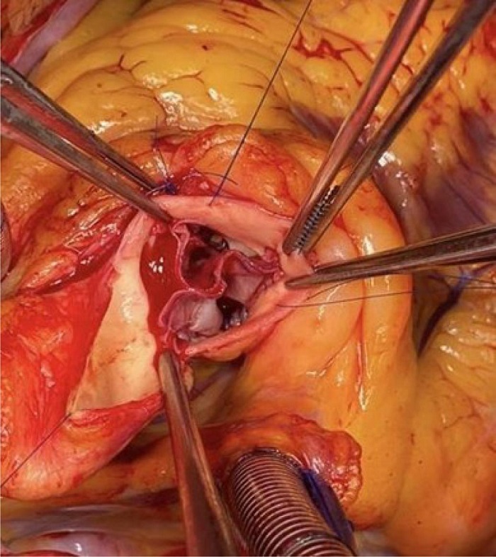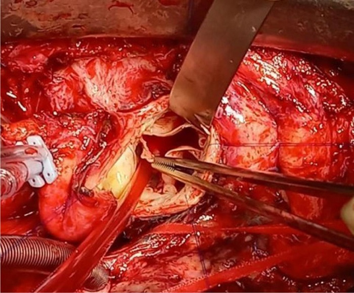 During this time, the patient is connected to cardiopulmonary bypass (CPB), and the heart is protected in the usual manner. The aortic valve is accessed through an aortotomy, resected, and the annulus is decalcified.