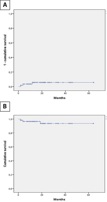 There were no cases of endocarditis or cerebrovascular accidents during follow-up. Transthoracic echocardiography was performed at 12 months of follow-up in 30 patients. Valve morphology was adequate, without calcifications or deterioration of the cusps. The mean gradient was 7.4 mmHg, and the peak gradient was 11 mmHg. One patient had moderate aortic insufficiency. It was decided to follow them clinically and echocardiographically before intervening. Two patients had severe insufficiency secondary to detachment of one of the neo-cusps at the commissural level (Figure 4). Valve replacement with prostheses was performed at two and four months post-surgery. Figure 5 shows freedom from aortic insufficiency > 3 and freedom from reintervention.