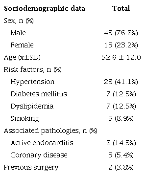 Forty-three male patients (76.8%) with a mean age of 52.6 ± 12 years (range 19 – 80) were included. Eight patients had active endocarditis, seven on native valve. The mitral valve was involved in three of them, and another was associated with a ventricular septal defect (VSD) and tricuspid endocarditis. Three patients had associated coronary artery disease, and one had a perimembranous VSD. Two patients had previous surgery (subaortic membrane and aortic valve replacement with biological prosthesis). The calculated operative risk with European System for Cardiac Operative Risk Evaluation (EuroSCORE) II was 2.3 ± 3.7%[12]. Excluding patients with endocarditis, the average EuroSCORE II was 1.3 ± 0.5% (Table 1).