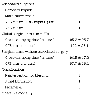Three cases presented aortic insufficiency on postoperative follow-up: one patient was admitted for decompensated heart failure two months after surgery, was medically compensated, and underwent an echocardiogram showing severe aortic insufficiency due to cusp prolapse. A second case consulted at four months after surgery for dyspnea. Echocardiography also showed severe insufficiency, and reoperation was decided. In the reoperation of both cases, partial detachment (5 mm) of the non-coronary cusp at a commissural level was confirmed. Valve replacement with biological prostheses was decided in the first case and mechanical in the second. However, it is likely that the cusp could have been repaired by a surgeon with more experience with the technique.