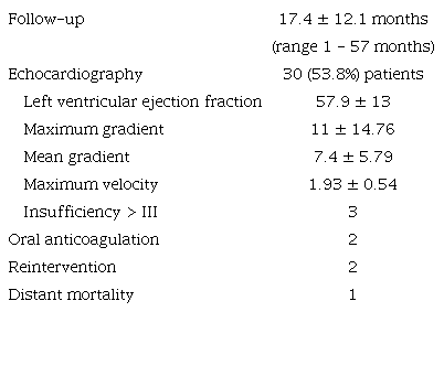 Postoperative echocardiography showed good valve morphology, low transaortic gradient, and absence of aortic insufficiency in all cases except three patients. One showed moderate valvular insufficiency at the commissural level. Commissural closure was performed with a suture, and subsequent control showed absence of insufficiency. Two patients had severe central insufficiency due to poor cusp coaptation, and the valve was replaced with biological prostheses in both cases.