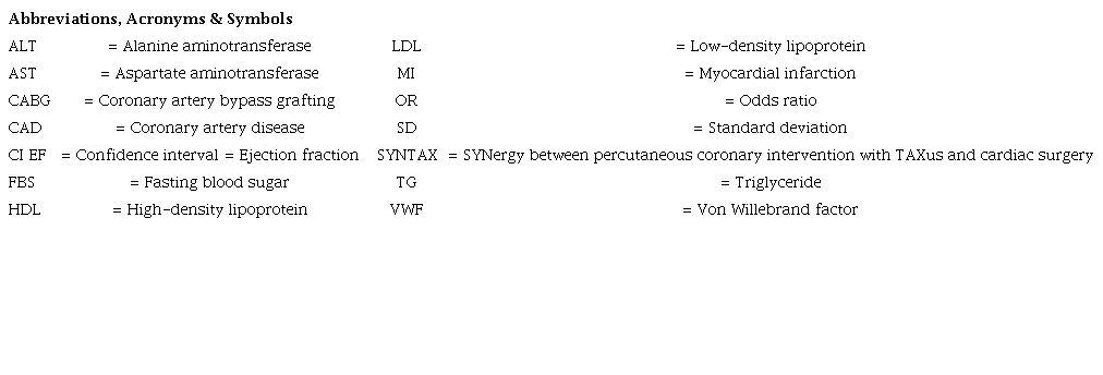 Conclusion: In patients undergoing coronary surgery, the SYNTAX score was found to be significantly lower in blood groups O and B. However, regarding mortality, both blood groups A and B carried a higher risk of death when compared to group O.