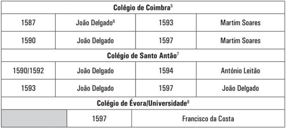 Com efeito, sabe-se que foi o padre João Delgado que fundou, em 1590, a aula pública da Esfera no Colégio de Santo Antão. Iniciador da tradição matemática na Província Portuguesa, onde segundo alguns autores contemporâneos, teria estudado teologia e matemática com Cristóvão Clávio, na Academia de Matemática do Colégio Romano, entre 1580 e 1585 (LEITÃO, 2008). A partir dessa data, lecionou em Coimbra, primeiro no Colégio de Jesus, um curso privado, depois no Colégio de Santo Antão (Quadro 1), atividade que manteve durante muitos anos, embora com alguns intervalos na lecionação para cumprimento das obrigações como arquiteto, cargo que tinha na Província Portuguesa jesuíta.