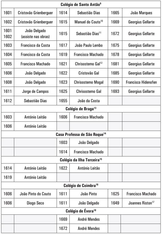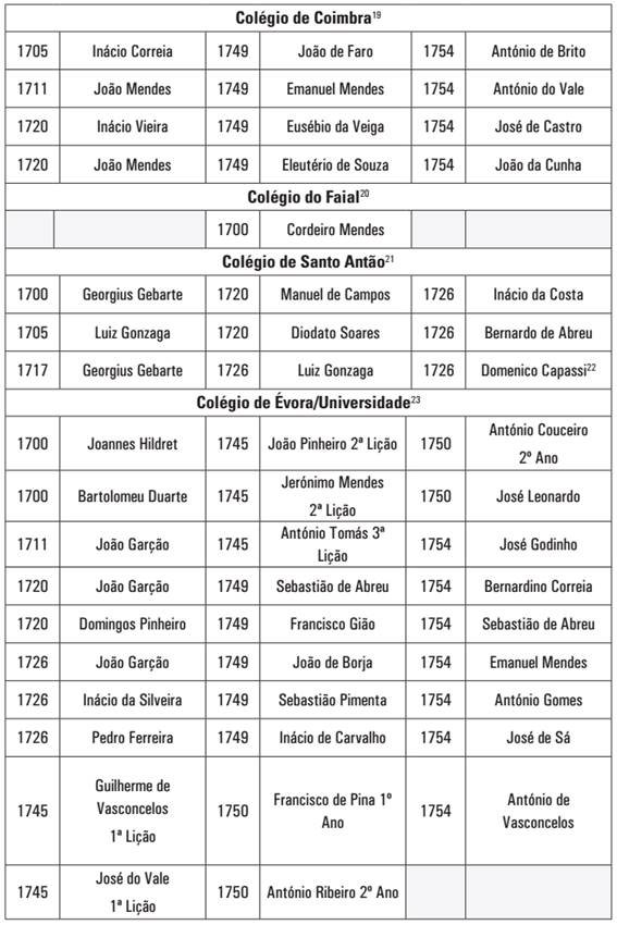 Ao longo do século XVII, pelo menos até a reforma de ensino do Geral da Companhia de Jesus Tirso Gonzalez, a matemática praticamente desaparece da lecionação dos colégios jesuítas em Portugal, somente se manteve com regularidade no Colégio de Santo Antão, em Lisboa. Em Coimbra, no Colégio das Artes, e na Universidade de Évora parece ter sido ministrada apenas durante alguns períodos. Interessante é verificar o ensino dessa cadeira de matemática nos colégios de Braga e Ilha Terceira, durante o período em que o padre António Leitão residiu nessas instituições (Quadro 2).