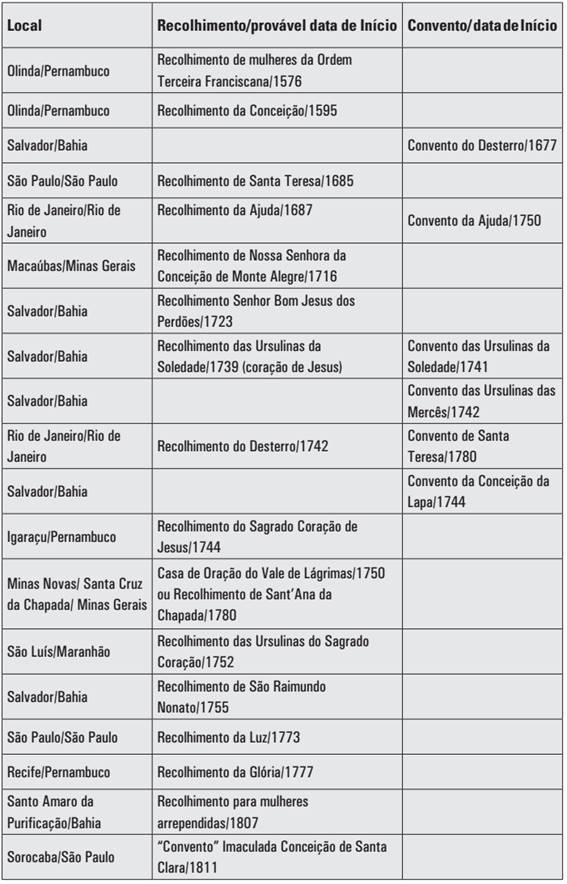 Como os recolhimentos surgiram de forma espontânea, torna-se difícil detectar o início de seu funcionamento e, portanto, parte-se das prováveis datas de fundação. Por outro lado, não é possível afirmar que existiram apenas essas instituições na América Portuguesa, uma vez que muitas podem ter existido e nunca ter solicitado permissão de funcionamento para a Coroa ou, ainda, para os bispados aos quais estariam vinculadas. Na análise do quadro acima, detecta-se um número superior de recolhimentos em relação ao de conventos. O primeiro tipo soma 15 instituições, das quais apenas duas conseguiram transformar-se em convento ainda no século XVIII. Outros quatro recolhimentos, que sobreviveram por mais tempo, conseguiram a passagem para a categoria de convento apenas no século XX2. Por outro lado, nota-se que os conventos setecentistas foram fundados nas cidades mais importantes da colônia, nas principais sedes administrativas e que concentravam uma forte presença da elite, quatro deles em Salvador e dois no Rio de Janeiro.