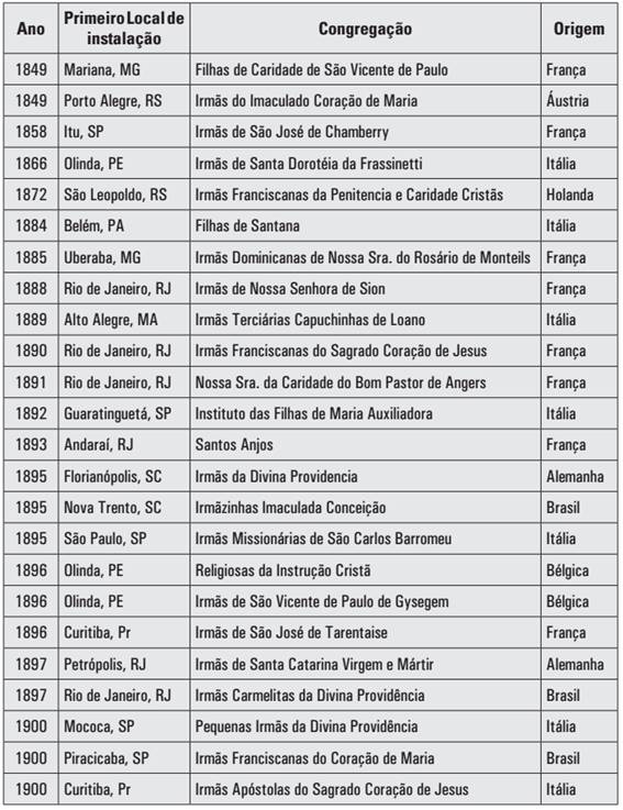 Verifica-se que vieram 24 congregações neste período: oito francesas, sete italianas, duas alemãs, duas belgas, uma holandesa e outra austríaca. Além destas, três congregações foram fundadas no Brasil. A mobilidade dessas freiras parte tanto das necessidades de afastamento de seus territórios de origem por problemas políticos quanto dos anseios da população nos locais de instalação pelas obras congreganistas, que abarcavam não somente a abertura de escolas femininas, como também o trabalho em hospitais, asilos e prisões. Por outro lado, observa-se um número significativo de irmãs francesas e italianas, sendo que as primeiras eram valorizadas em solo brasileiro principalmente por conta dos anseios de implantação de uma educação nos moldes da civilidade francesa, e a segunda, por conta do grande afluxo de italianos no movimento colonizador após a abolição da escravatura no Brasil. Observa-se ainda que a entrada das irmãs passou a expandir especialmente após a proclamação da República (1889) uma vez que não dependia mais do controle governamental para a autorização das entradas. Oscar Beozzo (1983), ao analisar as congregações femininas, aponta que durante a Primeira República Brasileira (1889-1930), "{...} são fundadas no Brasil ou chegam aqui dos vários países da Europa e mesmo de alguns outros países situados fora do continente europeu, 93 congregações." (BEOZZO, 1983, p. 127). Considera-se que esse movimento mais geral da expansão das congregações, desde o século XIX, abarcando toda a primeira metade do século XX, ainda deve ser estudado, pois se verificam muitos estudos isolados sobre cada Instituição, e poucos que perfazem o caráter mais geral do movimento congreganista no Brasil.