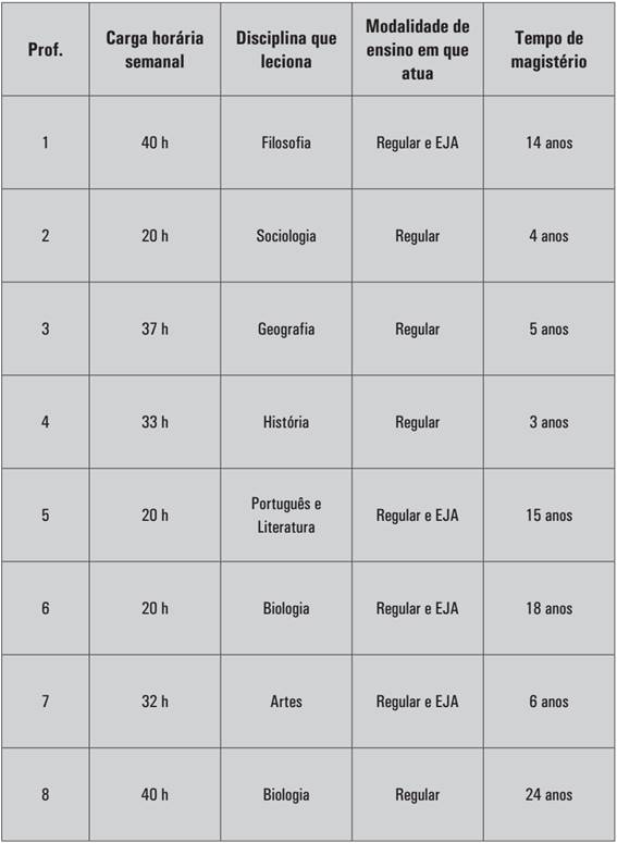 A entrevista ocorreu com oito professores, caracterizados no Quadro 1, apresentado abaixo, e teve, em média, duração entre 20 e 30 minutos com cada um. Essas entrevistas foram gravadas, com a autorização dos professores, e, posteriormente, transcritas.